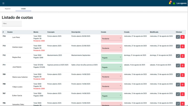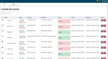 Visualiza las cuotas registradas con todo el detalle, y cambia el estado en caso de que ya haya sido cubierto el monto