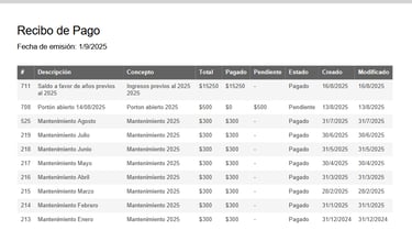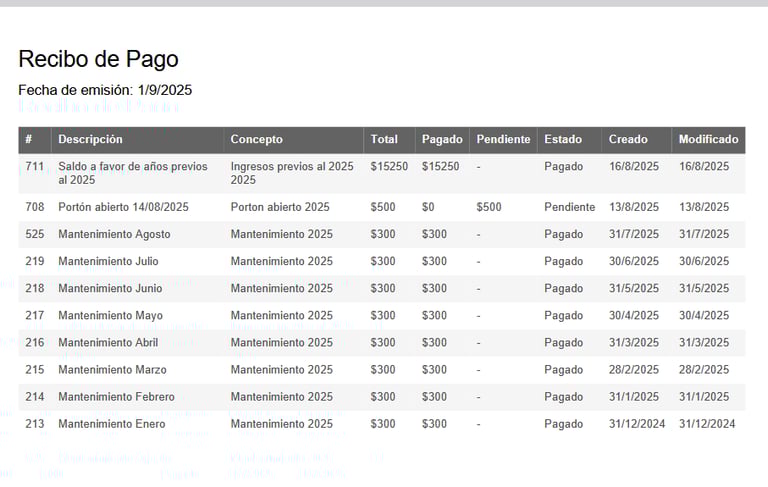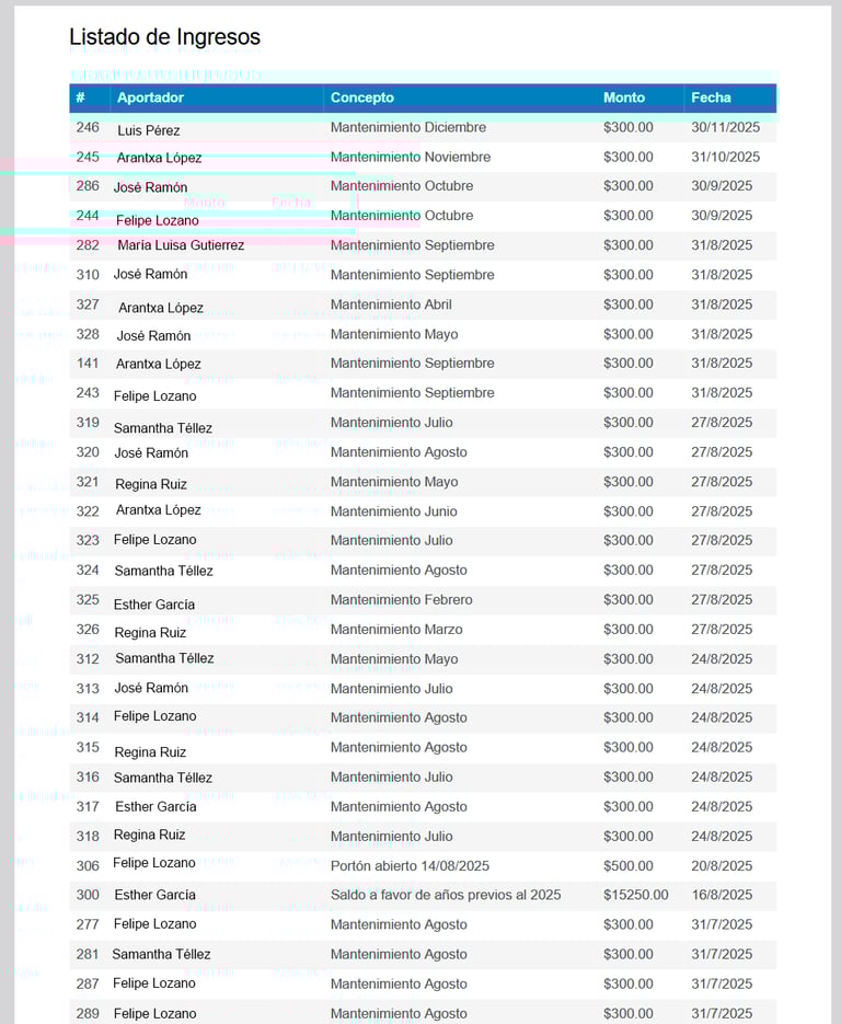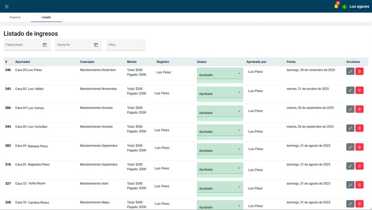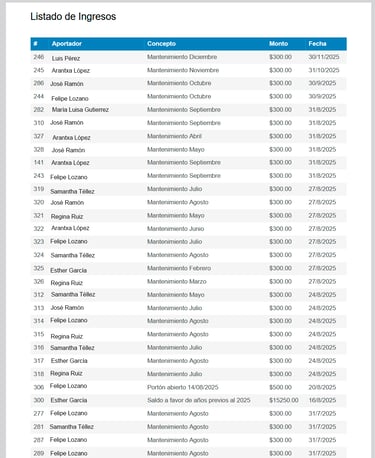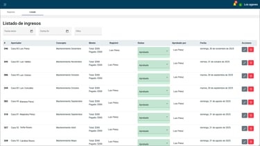 Filtra los registros por residente, por fecha, por concepto o por estado para poder tener mayor seguimiento de los ingresos que se han registrado, de igual manera que con los gastos, cuenta con la doble verificación de registro.