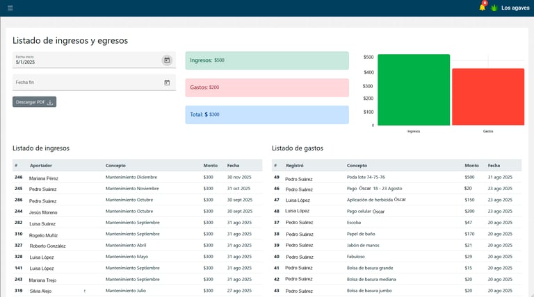 Visualiza un resumen comparativo de los ingresos y los gastos que ha tenido el fraccionamiento en un intervalo de fechas, además de contar con 2 tablas en donde se enlista el detalle de cada gasto e ingreso.