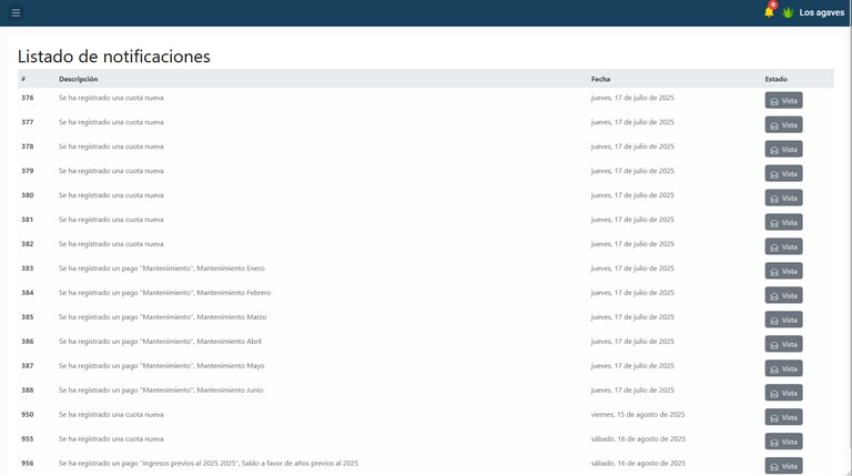 Espacio para que recibas una notificación cada que un pago que generaste es recibido, aprobado o cancelado, además de una notificación cada que se te genera un cargo nuevo a tu cuenta de residente.