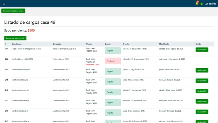 Visualiza tus pagos realizados y los cargos pendientes con todo el detalle, descripción, monto, estado, fechas, recibo, etc.