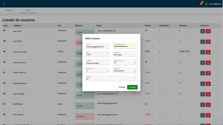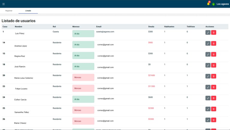 Visualiza todos los datos de los residentes, registra sus correos electrónicos, números de contacto, número de residencia, y visualiza los montos pendientes de cada residente.