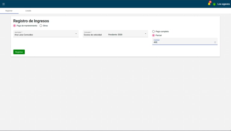 Registra las aportaciones de los residentes para cubrir tanto cuotas de mantenimiento, multas, o cualquier cargo que se les haya registrado.
